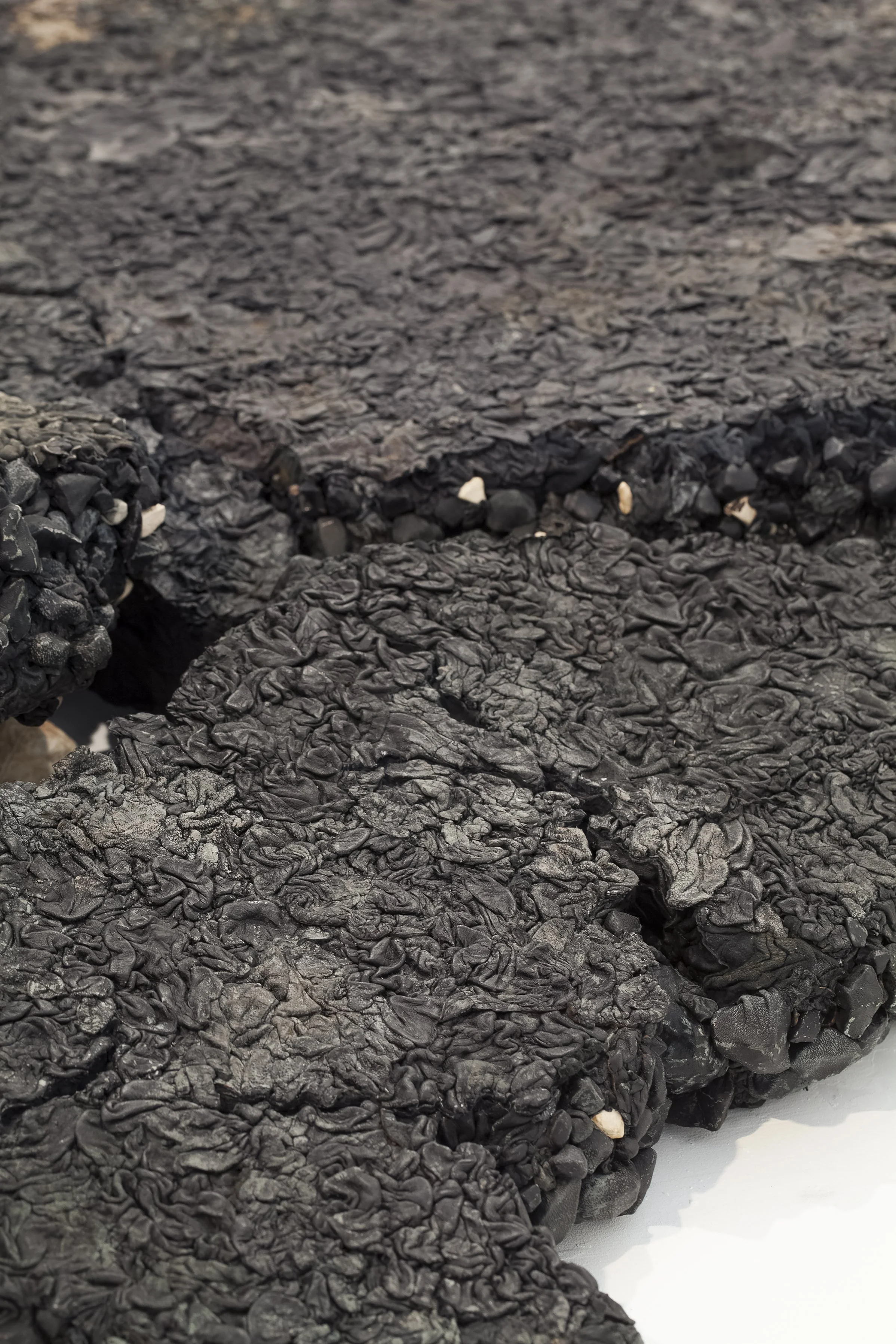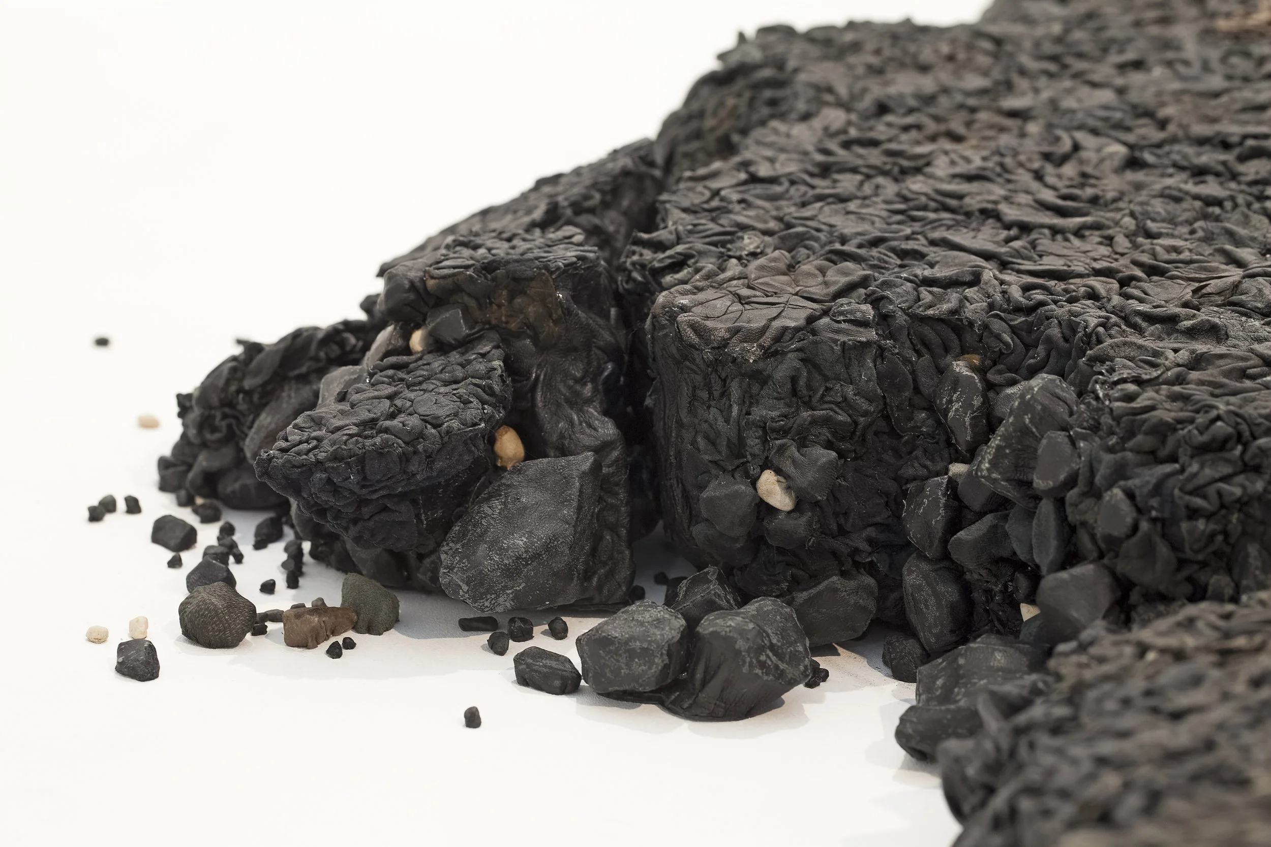 Approaching the work enhances the intensity of observation. There is something disturbing in the asphalt’s upper texture, which invites a closer examination, seeking physical relations. The viewer recognizes he is facing a leathery carcass, sprawled out like a large mammal with organic-like outlines. Abandoned soil and infrastructure waste, usually lying at the side of the road, reveal themselves as a 'well made' skin fabrication; a large plate, composed of a meticulous arrangement of thousands of tiny skin elements, individually placed and replicating a life-size model.