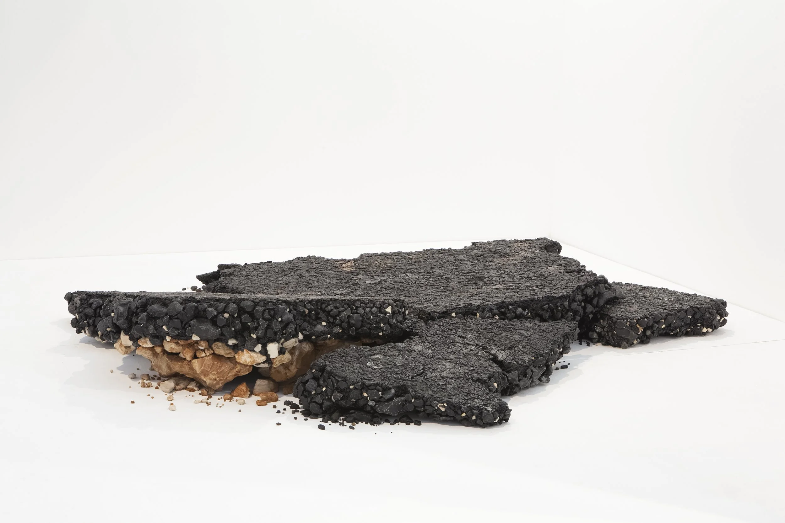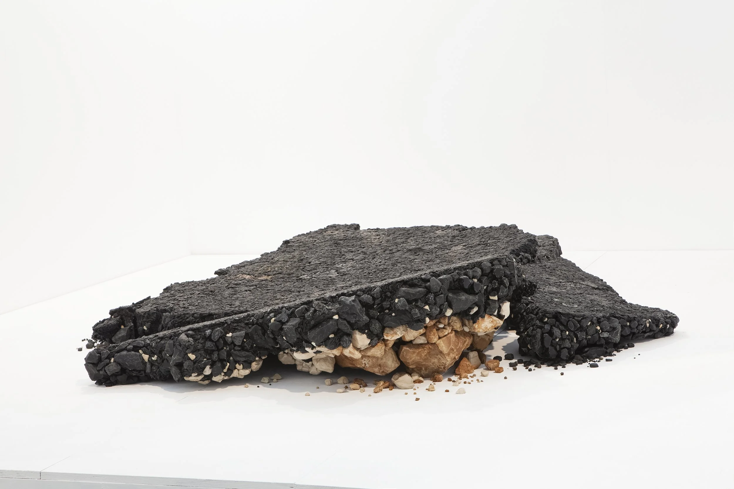 The broken asphalt planks serve as a foundation. Their edges expose the geology and ecology of the familiar urban land, in the same contrastive material structure of a black cast road, underneath which lays a white layer of gravel and limestone. The lower margins of the asphalt planks merge with the different types of soil: clods of red loam, stones, rocks, transforming into their own ecological niche.